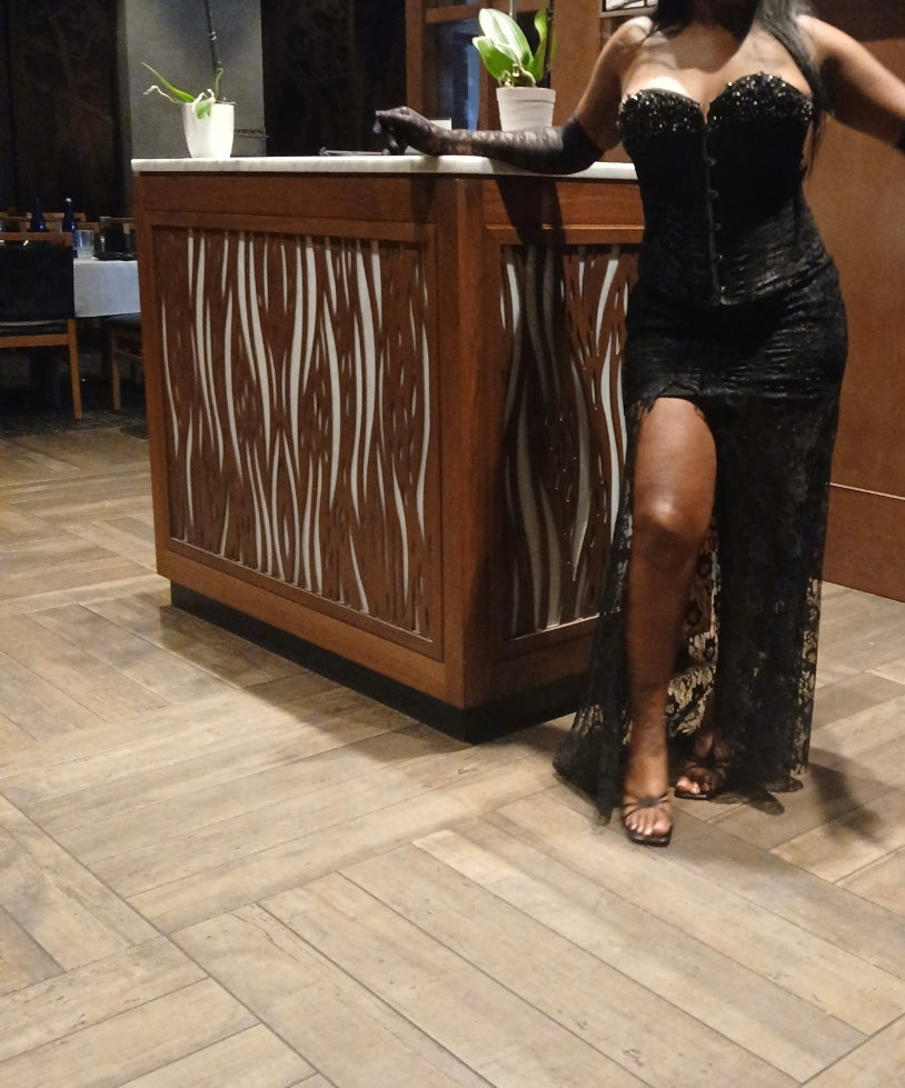 Two piece Custom Corset gown with black jewel embellishments across the breast area lace fabric mermaid style dress with thigh high split made with spandex underlining and lace top fabric
